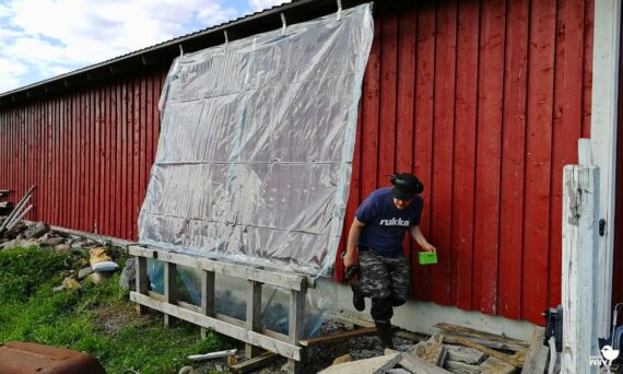 Rakensimme kasvihuoneen seinää vasten hyödyntämällä olemassa olevaa ja ostimme vain kasvihuonemuovin.