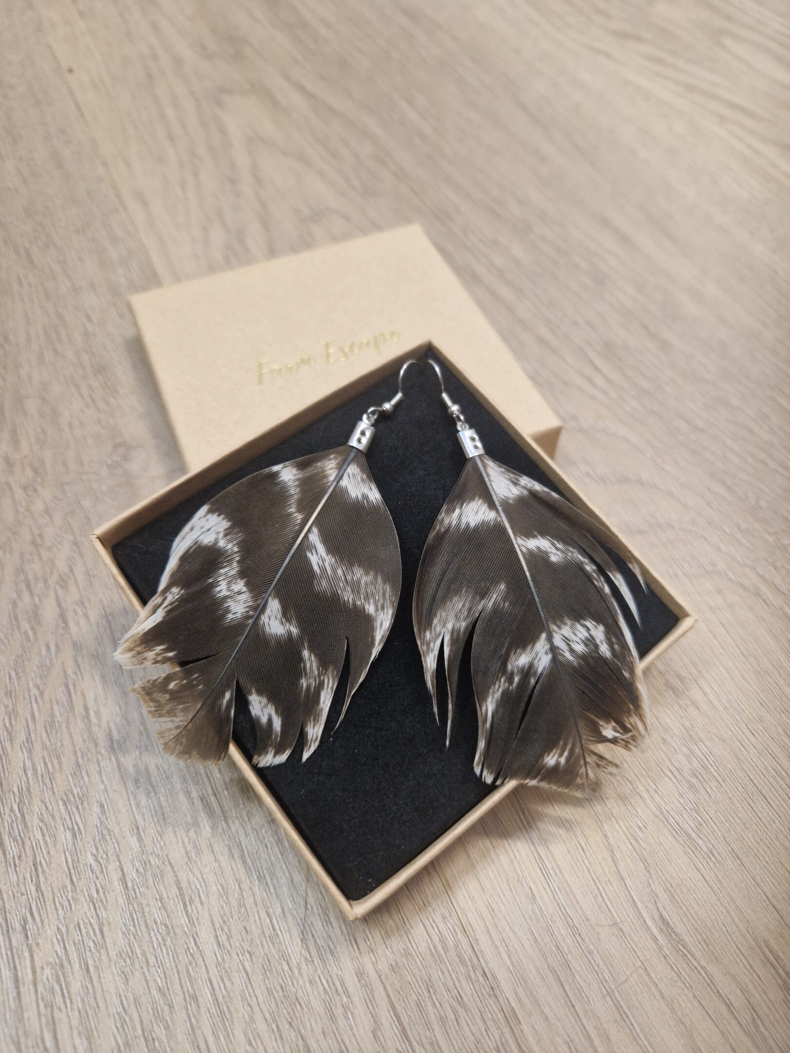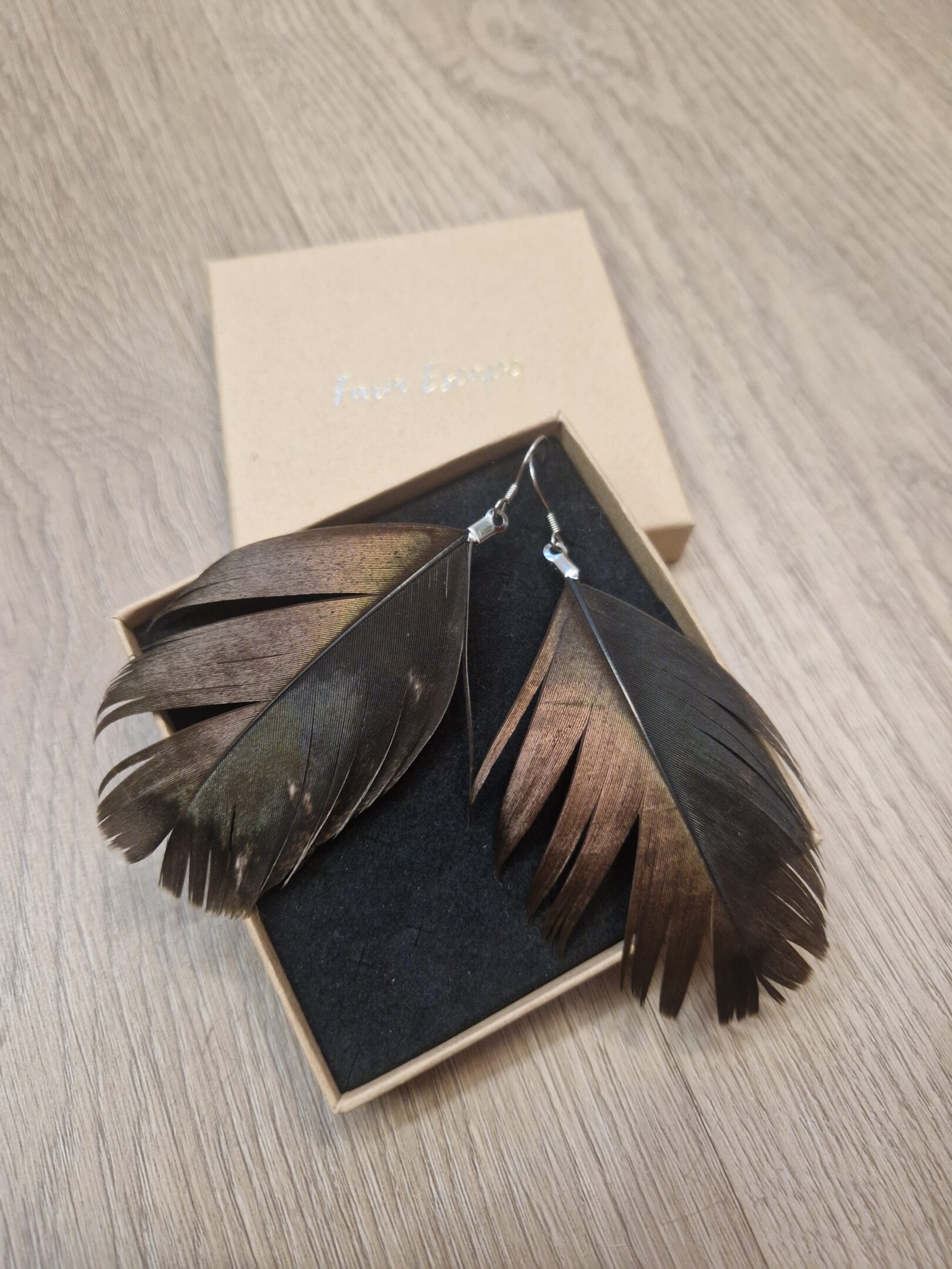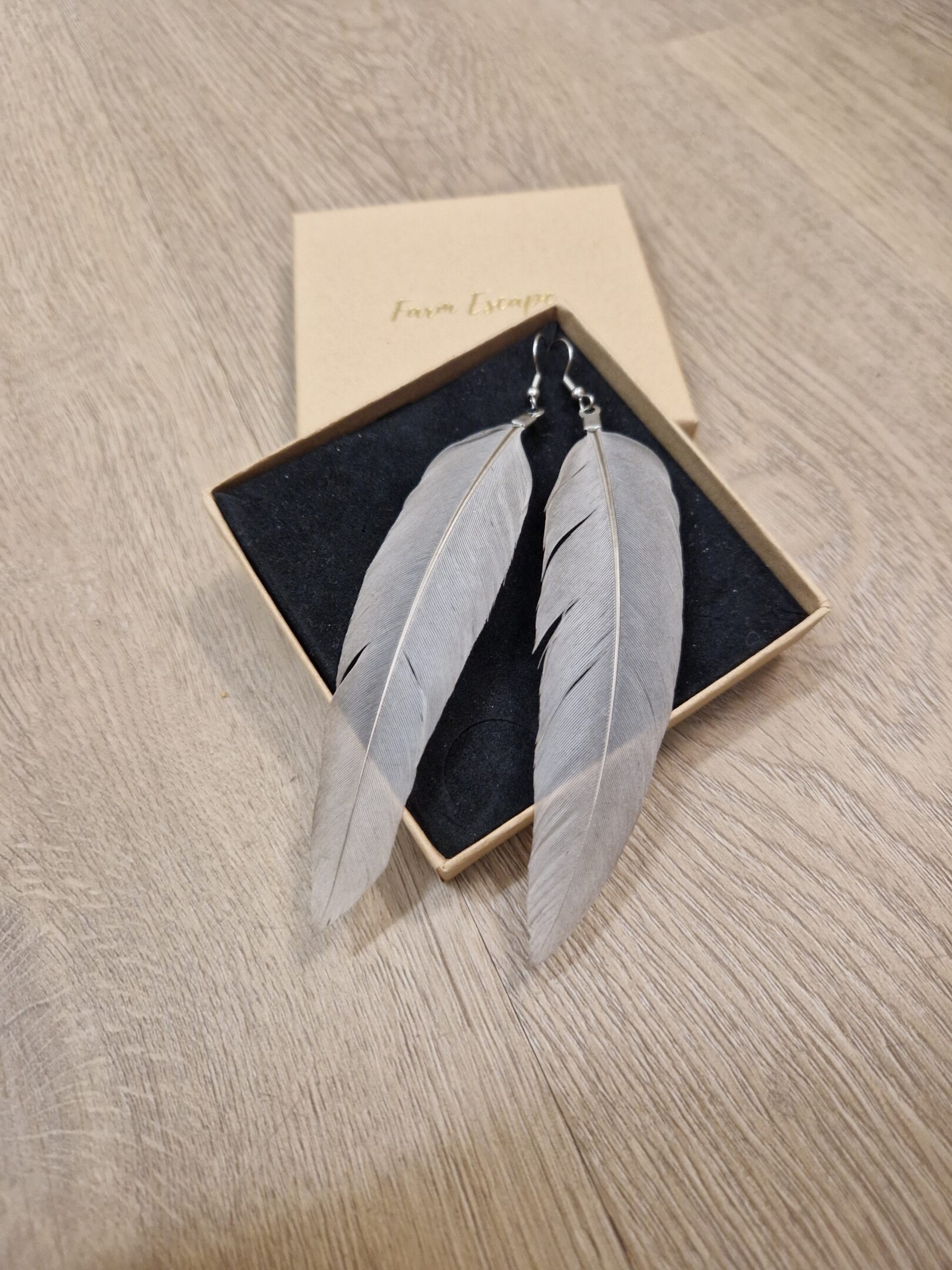 Find your favorite feather earrings for souvenir. Handmade at our farm from our bird feathers. Stainless steel. Price 37€.